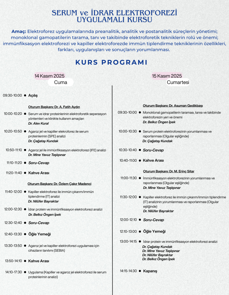 Değerli Katılımcılar, Türk Klinik Biyokimya Derneği İstanbul Şubesi tarafından 14-15 Kasım 2025 tarihlerinde İstanbul Medeniyet Üniversitesi’nde “SERUM ve İDRAR ELEKTROFOREZİ UYGULAMALI KURSU” düzenlenecektir. Elektroforez, preanalitik ve analitik evredeki özellikleri, yorumlanması ve klinisyene raporlanması açısından büyük önem taşıyan, günümüzde klinik laboratuvarlarda hastalıkların tarama, tanı ve takibi amaçlı yaygın olarak kullanılan bir tekniktir. TKBD İstanbul Şubesi bu nedenle elektroforezin temel ilkelerini anlatan, serum ve idrarda protein, immünfiksasyon ve kapiller elektroforezi yöntemlerini içeren bir kurs planlamıştır. Sizleri bu etkinliğe davet etmekten mutluluk duymaktayız. Saygılarımızla, |
